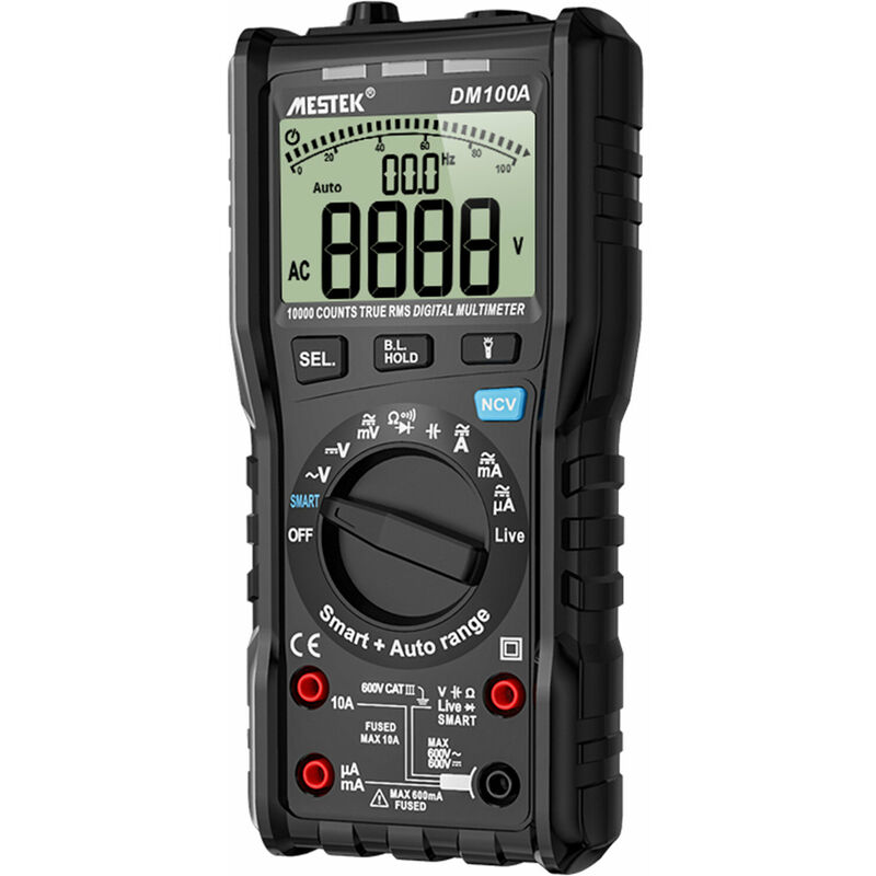 Caratteristiche: Funzioni principali: misurazione della tensione CA/CC, corrente CA/CC, resistenza, capacità, diodi/continuità, test NCV, test del filo sotto tensione e misurazione intelligente. Funzionamento di sicurezza: intelligente integrato chip e doppio fusibile per proteggere il multimetro da malfunzionamenti e ha una protezione da sovraccarico. Riconoscimento intelligente: l'ingranaggio di riconoscimento intelligente intelligente e l'ingranaggio automatico della gamma consentono all'utente di misurare più facilmente. Misurazione NCV: quando viene rilevata la tensione CA, produrrà un allarme acustico e luminoso in base all'intensità della tensione. Display LCD HD: barra analogica e display digitale per controllare facilmente i dati a colpo d'occhio, migliorare notevolmente l'esperienza di lettura. Illuminazione torcia: progettata con funzione di illuminazione per facilitare agli utenti di operare in luoghi bui. Spegnimento automatico: se non viene eseguita alcuna operazione