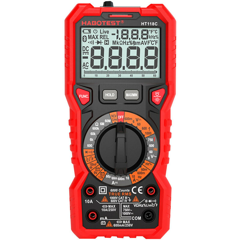 Caratteristiche: Ampio campo di misura: per misurare tensione CC/CA, corrente CC/CA, resistenza, capacità, test diodi, test NCV, test in tempo reale, test batteria, frequenza, temperatura, ecc. Gamma di temperatura: l'intervallo di test è -40~1000°C/-40~1832°F, conversione unità °C/°F. 2.7" Ampio display LCD: schermo LCD da 59 * 36 mm con ampia lettura digitale e retroilluminazione per una lettura chiara. Spegnimento automatico: 15 minuti di spegnimento automatico in caso di inattività, maggiore risparmio energetico. Portatile Design: staffa sul retro per supportare il multimetro e può anche essere appeso al muro. Protezione da sovraccarico: doppio fusibile integrato, protezione completa per un funzionamento sicuro. Altre funzioni: tenuta max/min, Blocco dati, Continuità, True RMS, Indicazione batteria scarica, Retroilluminazione a doppio colore, Indicatore LED jack di ingresso, Luce di lavoro, ecc. Specifiche: Materiale: ABS Display: 6000 conteggi />Gamma: portata manuale Display