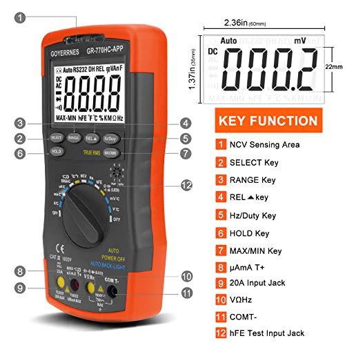 Multimetro digitale GR-770HC-APP TRMS 6000Couns Misuratore di Ampere AC DC senza contatto a misurazione automatica Misura con precisione Volt Amp Resistenza Diodi Continuità Capacitance Temperatura