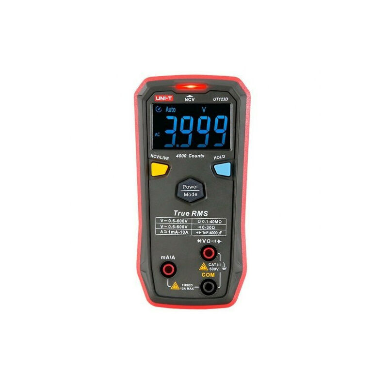 Campo di misura tensione CC e CA CC 600V ±(0,5%+3) CA 600V ±(0,8%+3) Campo di misura corrente CC e CA CC 10A ±(1%+3) CA 10A ±(1,2%+3) Campo di misura della resistenza 40M? ±(0,8%+2) Campo di misura della capacità 4000uF ±(4%+5) Dimensioni del display 44 mm x 26 mm Conteggio del display Fino a 4000 Test di continuità Funzione NCV (rilevamento della tensione senza contatto) L'indicatore luminoso cambia colore in base alla tensione Alimentazione 2 batterie (R03) da 1,5 V Dimensioni 130x65x28 mm Peso 130 g Sicurezza CAT III 600V Il multimetro digitale intelligente UT123D è progettato per identificare automaticamente tensione AC/DC, resistenza, diodo e continuità. Premendo un pulsante, è possibile selezionare manualmente tutte le modalità di misura, compresa la capacità. Il design compatto e il display EBTN lo rendono uno strumento eccellente per la casa, il bricolage e il lavoro in ambienti bui.