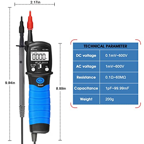 Funzione di conservazione dei dati: la penna portatile per tester volt può mantenere e congelare i dati di lettura con un pulsante, il che è pratico per la registrazione. Indicatore di livello della batteria, spegnimento automatico con avviso "Beep" dopo 15 minuti senza funzionamento per prolungare la durata della batteria. È anche possibile premere il pulsante "SELECT" per spegnere la funzione di spegnimento automatico.