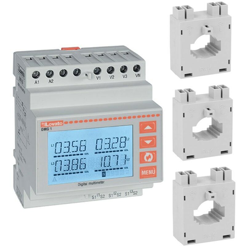 Kit Lovato composto da: 1 multimetro LCD ad icone retroilluminato, non espandibile codice DMG100 3 trasformatori di corrente toroidale 100/5A per cavi Ø22mm codice DM2T0100 1 multimetro codice DMG100: Multilingue: italiano, inglese, francese, tedesco, spagnolo e portoghese Tipo DMG100 Tipo Trifase + neutro Numero di moduli DIN 4 Tensione nominale ausiliaria AC: VAC 100...240 Tensione nominale ausiliaria DC: VDC 110...250 Tensione nominale di isolamento IEC/EN: 690V Tensione nominale di tenuta ad impulso (Uimp): kV 9.5 Tensione di tenuta alla frequenza di esercizio: kV 5.2 Frequenza di impiego: min 45 Hz - max 66 Hz Corrente nominale: 5 ampere Campo di misura: 0.01...6 Metodo misura: TRMS Grado di protezione: IP30 Sovraccaricabilità: +20% Ie da TA esterno con secondario 5A Limite termico di breve durata: 50A per 1s Potenza assorbita: Max VA 1.5 Potenza massima dissipata: 0.5W Tipo custodia: poliammide Attacchi tipo: Fissi Coppia di serraggio (Max): Nm 0.8 - lbin 7 Fissaggio: Guida DIN Peso