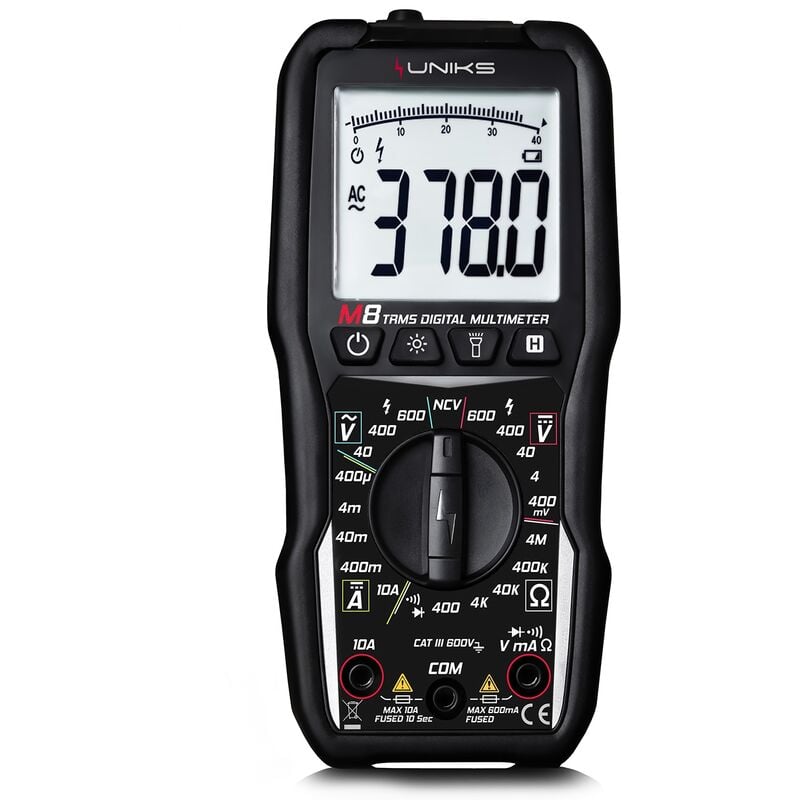 M8 rappresenta la gamma UNIKS di multimetri digitali di piccole dimensioni ma con caratteristiche di misurazione e costruttive di alto livello, dotato di una luce LED per gli ambienti poco illuminati inoltre la guina ha la funzione di incastro puntali per facilitare le misure nei quadri elettrici. Le misure di Tensione fino a 600V AD/DC e Corrente fino a 10A sono in TRMS (Vero Valore Efficace) con larghezza di banda di 400Hz. E' dotato di ampio Display con funzione Bar-graph ed è protetto dalle sovratensioni su tutta la gamma di misura. Categoria di sovratensione è CAT III 600 V La misura di corrente è selezionabili nelle scale 10A, uA e mA DC Misura di Resistenza, Continuità e Prova diodi. La funzione NCV permette di utilizzare il multimetro come un rilevatore di Tensione senza contatto sfruttando un sensore posizionato sulla parte superiore del multimetro inoltre la stessa funzione può essere eseguita con un puntale rendendola ancora più precisa. Normative di riferimento EMC & LVD