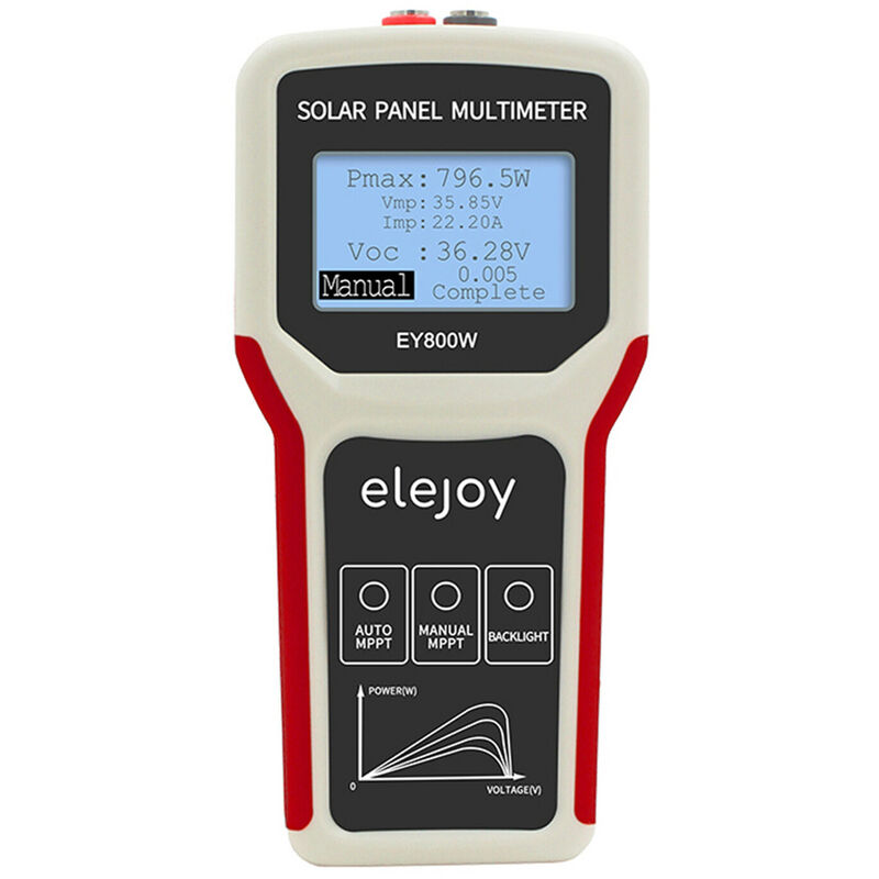 Rilevamento MPPT: quando si preme il pulsante di test AUTO MPPT, lo strumento regola automaticamente l'intervallo di tempo del test in base al valore di potenza corrente e aggiorna il display digitale. Ad esempio, quando la potenza del pannello solare è di 100 W, aggiornare una volta ogni 5 secondi. Rilevamento MPPT manuale: Quando si preme il pulsante di test MPPT manuale, lo strumento avvia una scansione di il punto di massima potenza e aggiorna il display digitale. Visualizzazione in tempo reale della tensione a circuito aperto: La tensione a circuito aperto verrà visualizzata sull'ampio schermo LCD in qualsiasi momento, offrendoti un'esperienza migliore. Ampio display LCD retroilluminato: Lo schermo adotta un ampio LCD con retroilluminazione per una facile lettura, sia di giorno che di notte;