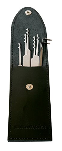Si possono aprire cilindri profilati e lucchetti. Il set viene fornito in una custodia in vera pelle di alta qualità