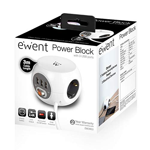 Presa di alimentazione cubica compatta con porte USB. Presa di corrente cubica con 3 prese di corrente e 3 porte USB-A (max. 2,4 A) per la carica di tablet e smartphone;