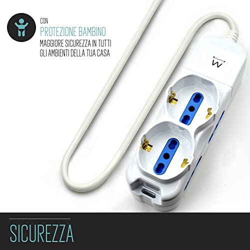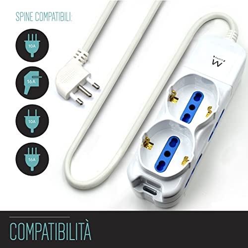 Multipresa a 6 Posti, Ciabatta Elettrica con 6 Prese (2 Italiane e Schuko/Tedesche + 4 Italiane 10A/16A) - Spina Italiana 10A - Potenza 250V/2500W - Cavo da 1,5 Metri, Prese Angolate a 45°
