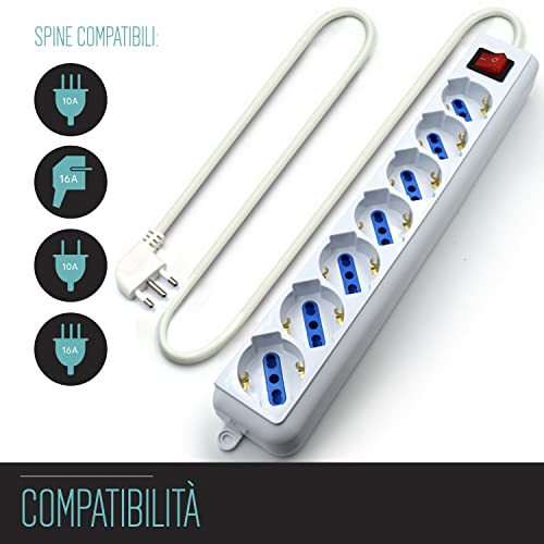Multipresa a 7 Posti, Ciabatta Elettrica con 7 Prese Italiane 10A/16A e Schuko (Tedesche) - Spina Italiana 16A - Potenza 250V/2500W - Cavo da 1,5 Metri, Prese Angolate a 45°