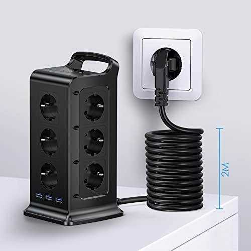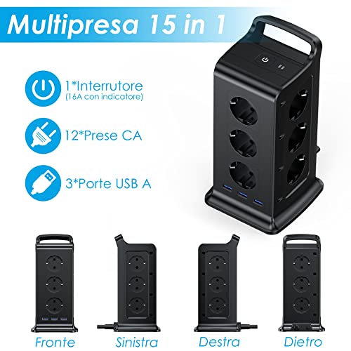 Multipresa Verticale LENIMINO 3680W 16A con 12 Prese CA 3 Porte USB-A Multipresa Ciabatta Torretta Elettrica con Protezione Sovratensione per Cellulare, Tablet, Laptop, Casa, Ufficio, Albergo