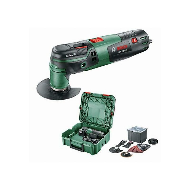 Multiutensile PMF 250 CES Questo versatile tuttofare è adatto per affrontare numerosi progetti. Il motore da 250 W offre la potenza necessaria, la preselezione elettronica della velocità consente di lavorare in base al materiale. Ampia gamma di accessori opzionali Starlock, per numerose applicazioni, sistema AutoClic Bosch, per sostituire l'accessorio in modo semplice e veloce, in soli 3 secondi. L'utensile multifunzione oscillante PMF 250 CES può troncare, tagliare, levigare, raschiare, fresare, raspare e lucidare su legno, metallo, plastica, cartongesso, stucco e malta. L'accessorio di aspirazione aiuta a mantenere pulita l'area di lavoro. Dati tecnici: Potenza del motore: 250 W Numero di giri a vuoto: 15 000 - 20 000 Angolo di oscillazione: 1.4° Peso: 1.2 kg Dotazione: PMF 250 CES Lama per tagli dal pieno BIM Wood and Metal AIZ 32 APB (1x) Lama a segmenti HCS Wood ACZ 85 EC (1x) Lama segmentata HM-Riff ACZ70RT5 (1x) Raschietto HCS ATZ 52 SC (1x) Piastra di levigatura AVZ 93 G (1x)