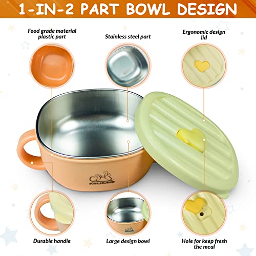 MUMO Set Pappa Svezzamento Bambini, Ciotola in Acciaio Inox con Ventosa con 1 Bavaglino in Silicone e 2 cucchiai Sensibili alla Temperatura di colore Arancione, Senza BPA