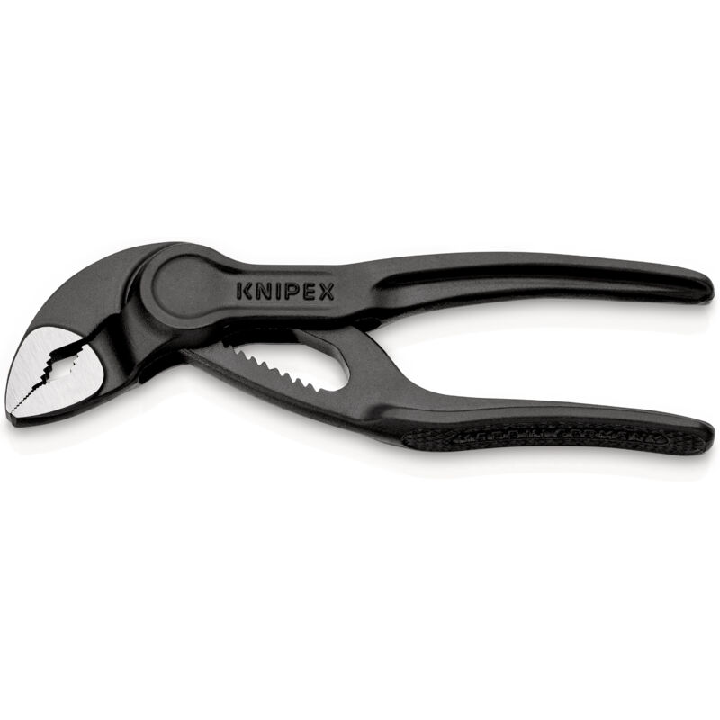 La Pinza regolabile di nuova generazione per tubi e dadi Knipex 87 00 100 Cobra XS con lunghezza 100mm ha una regolazione di precisione con 11 posizioni con fermo di contrasto per evitare lo schiacciamento accidentale. Il sistema autoserrante per tubi e dadi permette nessuno slittamento sul pezzo da stringere e minimo sforzo di lavoro grazie anche alle superfici delle ganasce con denti trattati con speciale tempera, durezza dei denti ca. 60 HRC. La Pinza regolabile Knipex Cobra XS ha una cerniera passante con doppia guida per un'elevata stabilità e lo scatto sicuro del perno cerniera non si ha nessun spostamento accidentale della regolazione. Il modello XS essendo molto compatto e la testa sottile permette l'accessibilità ottimale negli spazi più stretti con una capacità di presa di Ø 28 mm, apertura fino a 24 mm con solo 100 mm di lunghezza. Caratteristiche tecniche Testa molto sottile Regolazione di precisione con una mano per un adattamento più facile a diverse dimensioni del pezzo