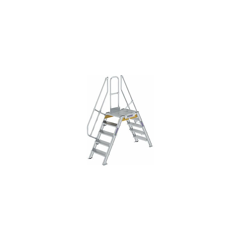 Ponte, portata totale 300 kg, 5 gradini, piattaforma 800 x 600 mm. Fornitura = montato. Tipo di prodotto = ponti a scala. Altezza utile = 1174 mm. N. gradini, piattaforma inclusa = 5 pz. Sbraccio = 2142 mm. Materiale telaio = profilato estruso in alluminio. Materiale gradini = alluminio, striato. Profondità gradini = 200 mm. Angolo d'inclinazione = 60°. Portata totale = 300 kg. Lunghezza piattaforma = 800 mm. Larghezza piattaforma = 600 mm. Larghezza gradini = 600 mm. Per il passaggio su macchine, nastri trasportatori o fosse. Per lavorare in modo sicuro e senza fatica, anche per lungo tempo. Comoda salita, angolo d'inclinazione di 60°. Portata totale 300 kg. Estremità inferiore montanti con piedini in profilato angolare per il fissaggio a terra. Estremità superiori dei montanti chiuse e assemblate a vite ai profili della piattaforma. Gradini chiusi antitorsione. Un parapetto alto 1100 mm in dotazione, da montare a destra o a sinistra. Secondo parapetto come accessorio. Viene