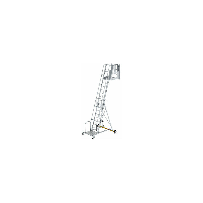 Scala per autocisterna, tipo 2, senza gabbia di protezione. Fornitura = montato. Materiale telaio = alluminio. Larghezza piattaforma = 850 mm. Profondità piattaforma = 1080 mm. Salita = su un lato. Versione da salita = pioli. Altezza piattaforma = 4300 mm. Altezza totale = 5400 mm. Profondità totale = 3160 mm. Larghezza totale = 2040 mm. Tipo di prodotto = scale per autocisterna. Diametro ruote = 150 / 280 mm. Peso = 390 kg. Con 2 rotelle pivottanti Ø 150 mm (salita), 2 ruote Ø 280 mm (supporto). Stabili montanti a sezione quadrata. Piattaforma in griglia R13. Pioli in tubi quadri con superficie rigata su ambo i lati 30 x 30 mm. Accoppiamento gradino/montante flangiato 4 volte. Guide ed elementi di giunzione in acciaio inox. Questa scala a 2 elementi in alluminio per autocisterne ha una piattaforma e una gabbia di protezione (elemento obbligatorio da ordinare separatamente). Facile regolazione dell'altezza da piolo a piolo grazie a un verricello a fune e a un meccanismo di bloccaggio.