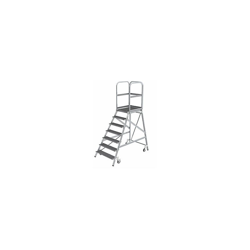 Scala a palchetto con salita su un lato, piattaforma e gradini in griglia, 7 gradini incl. piattaforma. Fornitura = smontato. N. gradini, piattaforma inclusa = 7 pz. Materiale telaio = alluminio. Larghezza piattaforma = 660 mm. Profondità piattaforma = 800 mm. Profondità gradini = 200 mm. Salita = su un lato. Versione da salita = gradini. Materiale gradini = griglia zincata a fuoco. Altezza piattaforma = 1680 mm. Profondità totale = 1920 mm. Larghezza totale = 1000 mm. Tipo di prodotto = scale a palchetto. Diametro ruote = 125 mm. Peso = 65 kg. Telaio in robusti profilati estrusi di alluminio. Parapetto su 3 lati. Senza carico spostamento agile - Sotto carico stabilità assoluta. 4 rotelle pivottanti frenanti, di cui 2 con fermo. Parapetto, alto 1000 mm, con traversina a livello del ginocchio. Zincatura a fuoco. Profondità gradini 200 mm. Corrimano non compreso nella fornitura. Secondo DIN EN 131-7 per la salita su scale a palchetto con pendenza di salita maggiore di 60° i