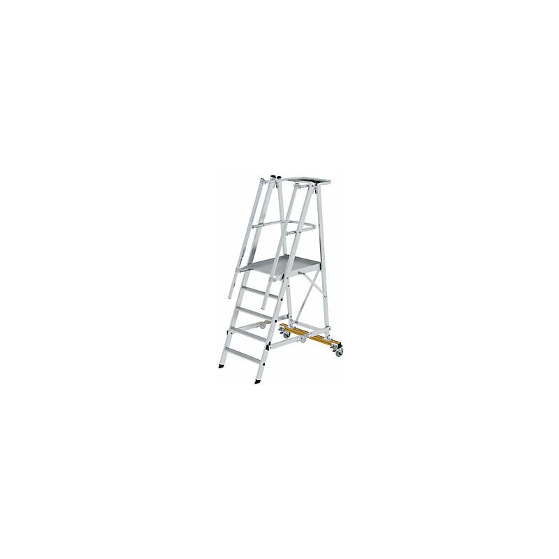 Scala in alluminio a piattaforma, con rotelle, piattaforma con parapetto su 3 lati, 5 pioli incl. piattaforma. Fornitura = montato. N. gradini, piattaforma inclusa = 5 pz. Materiale telaio = alluminio. Larghezza piattaforma = 650 mm. Profondità piattaforma = 600 mm. Profondità gradini = 80 mm. Salita = su un lato. Versione da salita = gradini. Materiale gradini = alluminio con rivestimento antisdrucciolo. Altezza piattaforma = 1150 mm. Profondità totale = 1400 mm. Larghezza totale = 1000 mm. Larghezza traverse = 1000 mm. Tipo di prodotto = scale a piattaforma. Peso = 37 kg. Scala per professionisti, per lavorare in modo comodo e sicuro. Pieghevole, per un ingombro ridotto. Corrimano di sicurezza su entrambi i lati e ampia vaschetta portamateriale. Piattaforma con parapetto su tre lati alto 1000 mm, con traversa ad altezza ginocchio. Fune di sicurezza sul lato di salita. Gradini rigati, profondi 80 mm. Flangiatura di qualità ad alta resistenza. Ottima aderenza al pavimento grazie ai