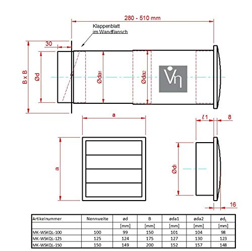 Muro di vibrazione NW 125 cappa tubo telescopico lamelle a chiusura mkwskqlw125