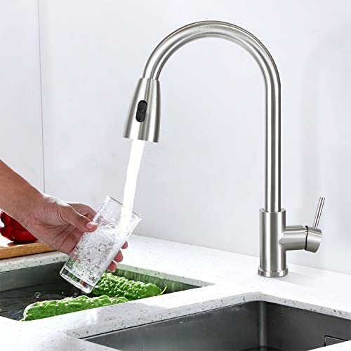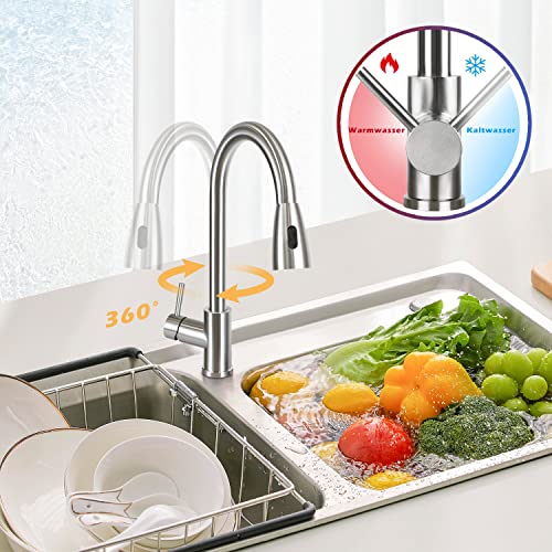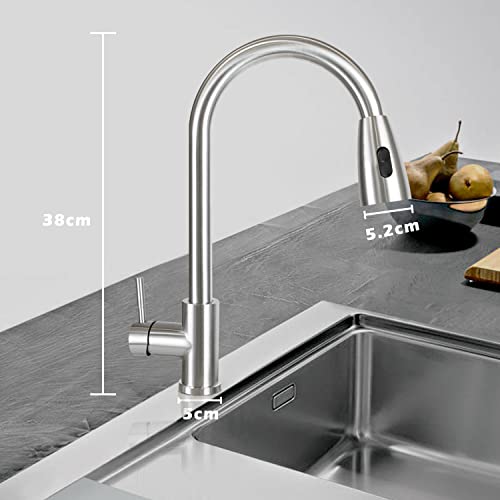 Mursche Rubinetto da cucina ad alta pressione, con doccetta estraibile, girevole a 360°, in acciaio inox, con 2 tipi di getto, in nichel spazzolato