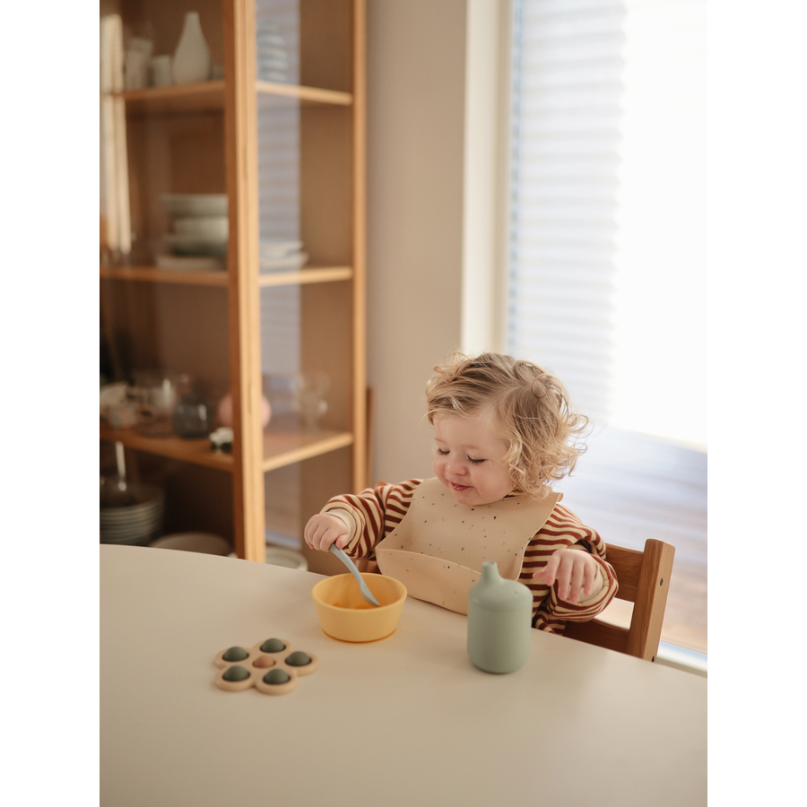 Dettagli del prodotto: Età: da 5 mesi Bavaglini colorati in silicone Idrorepellente per lo sporco La tasca profonda cattura il cibo e mantiene il bambino e il suo ambiente puliti La chiusura del collo arrotondata e integrata assicura una vestibilità confortevole Facile da pulire: lavare con sapone e lasciare asciugare all'aria. 100% senza BPA, PVC e ftalati Progettato e prodotto in Danimarca Design: Arcobaleno Materiale e dimensioni: Materiale: silicone 100% senza BPA, PVC e ftalati Incluso nella consegna: 1 bavaglino in silicone