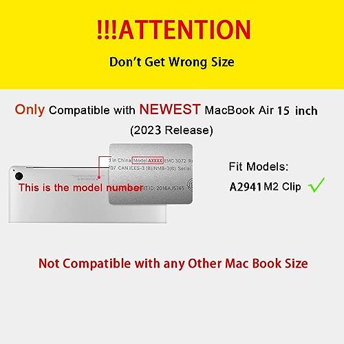 【COMPATIBILITÀ】Compatibile solo con il nuovo 2023 MacBook Air 15 M2 (modello: A2941, rilasciato nel 2023). Per 2023 MacBook Air 15 con schermo da 15,3 pollici. Avvertenza: controllare gentilmente il numero di modello "AXXXX" sul retro del laptop prima dell'acquisto. Non adatto ai vecchi MacBook Pro 15 (modello: A1990, A1707) e Non 2022 MacBook Air 13 M2 (modello: A2681) e Non 2020-2018 MacBook Air 13 pollici (modello: A2337 A2179 A1932) e Non 2017-2010 MacBook Air 13 (modello: A1369, A1466).
