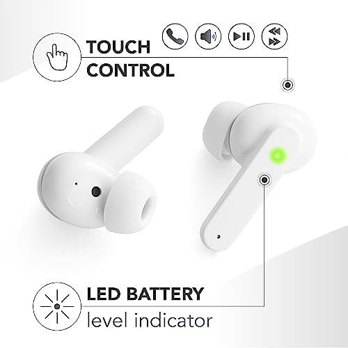 Controlli touch. Canzoni e chiamate gestite direttamente dall'auricolare. Play time auricolari: 5 ore, Play time totale con custodia di ricarica 25 ore.