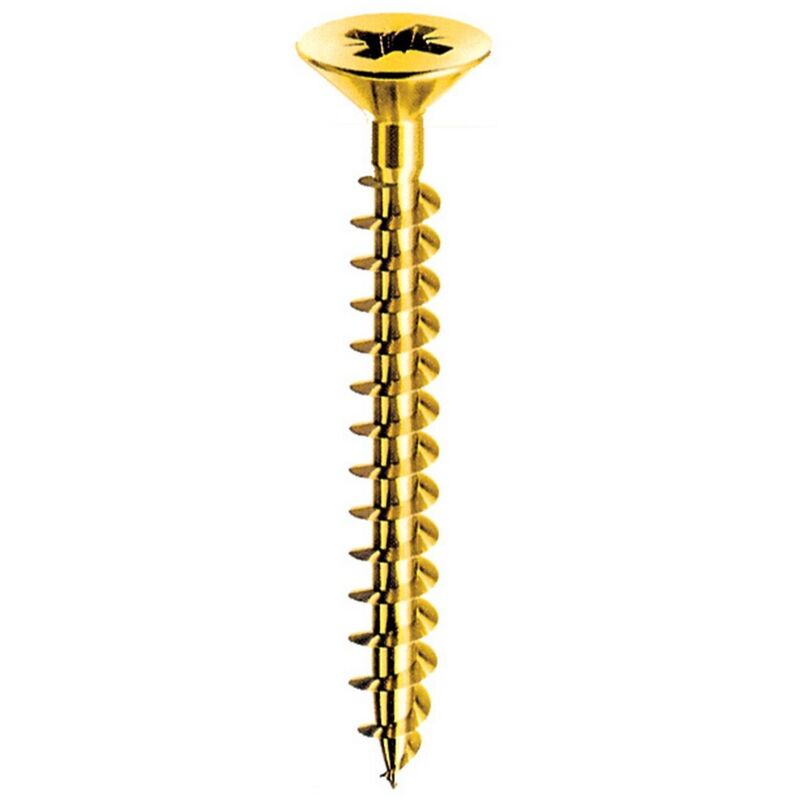 Vite universali a testa svasata piana adatta per l'avvitamento senza preforo su pannelli truciolari, legni naturali duri e teneri, materiali termoplastici, lamiere sottili. 3x20 mm. Ottonata Lucida