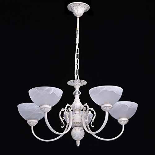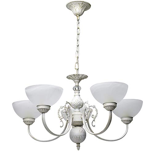 Classico lampadario a 5 braccia in colore bianco con paralumi di vetro opachi per camera da letto, soggiorno, corridoio, cucina, studio