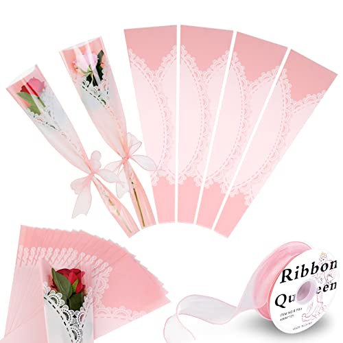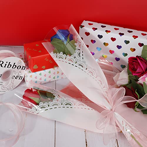 MWOOT 20 Pezzi Fiore Singolo Borsa da Imballaggio, Rosa Singola Carta per Incartare (Plastica), Borsa Bouquet Fiori per Regali di Festa della Mamma San Valentino Decorazione, con Nastro di Chiffon