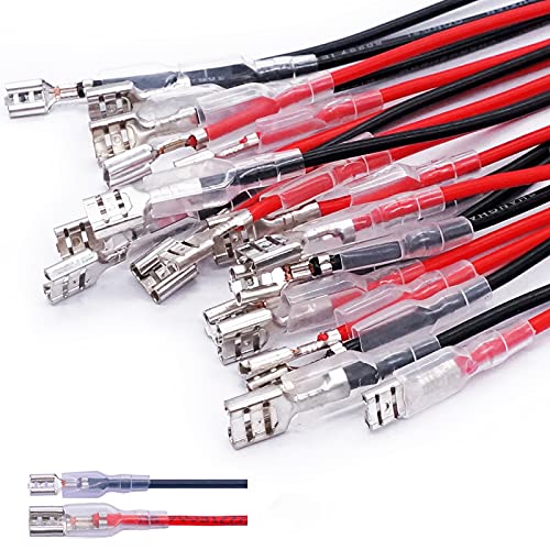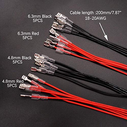 Mxuteuk 20 pezzi 4.8mm e 6.3mm Terminale a crimpare a forcella femmina con guaina isolante e filo Kit assortimento di giunzione rapida a forcella femmina rossa + nera