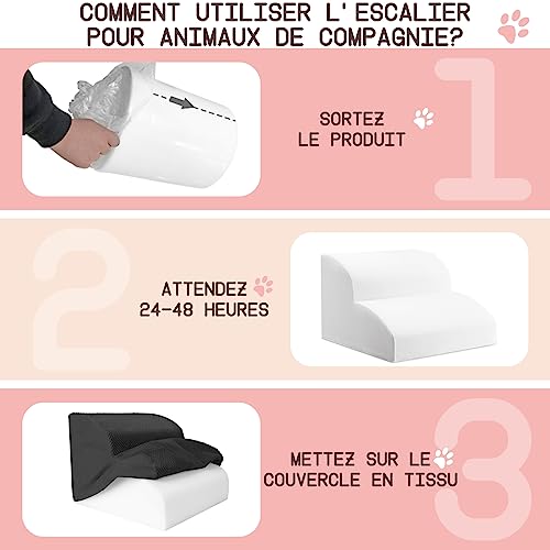 【Rampa antiscivolo per animali domestici】 Il fondo della scala per cani a 2 gradini ha un design trasparente di impronta di zampa in silicone, che ha una buona stabilità e non è facile da scivolare, e può essere utilizzato per pavimenti, tappeti e piastrelle. Suggerimento: inviamo 1 rotolo di viscosa per comodità nella pulizia dei peli sul divano scala cane.