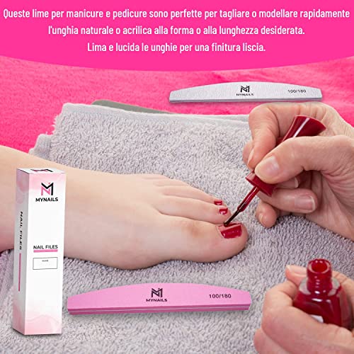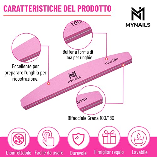 MYNAILS - Lima professionale per unghie, set di 5, 2 lime per unghie mezza luna 100/180, 2 buffer unghie bianche 180/180 e 1 lime per unghie Buffer mezzaluna rosa e bianco 100/180, confezione