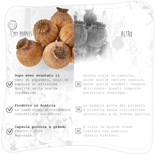 [Caratteristiche principali/Vantaggi] Le capsule di papavero essiccate di MyPoppies offrono un fascino rustico e unico per i tuoi lavori di hobbistica e decorazioni. Sono perfette per progetti fai-da-te, decorazioni per la casa e arrangiamenti floreali.