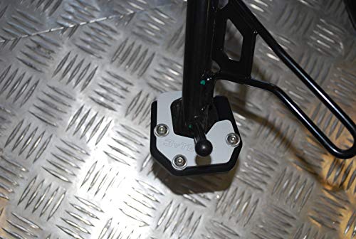 La base allargamento cavalletto laterale raddoppia la superficie d'appoggio della moto potendola posteggiare su terreni instabili e dandole più stabilità da ferma.