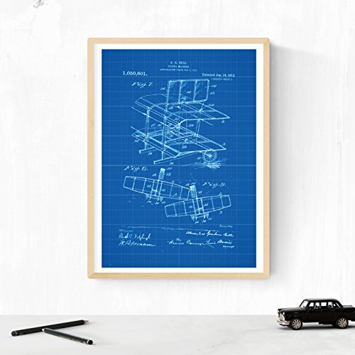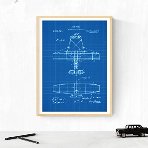 Nacnic set 4 stampe artistiche brevetti macchine volo, sfondo blu. Disegno d'igegneria, vecchie invenzioni e brevetti. .