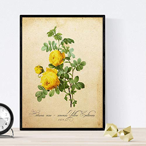 Nacnic vintage poster fiori. Stampa Hibiscus rosa - Con un design vintage giallo. Botanica interior design. formato A4