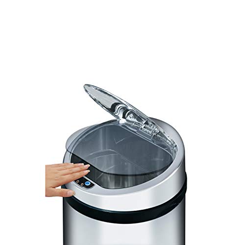 Descrizione del prodotto: pattumiera automatica 42 litri in acciaio inox - apertura e chiusura automatica - alta qualità del design in acciaio inox cromato - Funziona con 4 batterie D (LR20) (non incluse) - portapacchi incluso - Dimensioni: 30,5 x 76,5 cm (diametro x altezza).