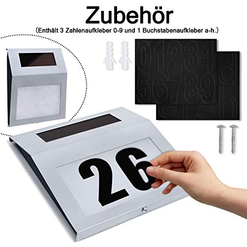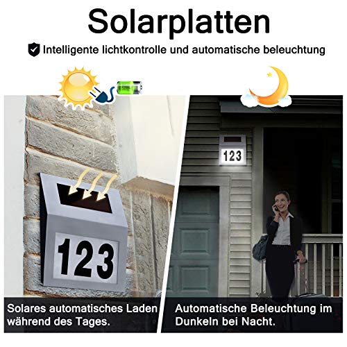 Numero civico illuminato a energia solare - Colore: argento, materiale: plastica + acciaio inossidabile, dimensioni (circa): 20 * 18 * 3 cm. Ci sono 3 set di adesivi numerici da 0-9 e 1 set di lettere da a-h.