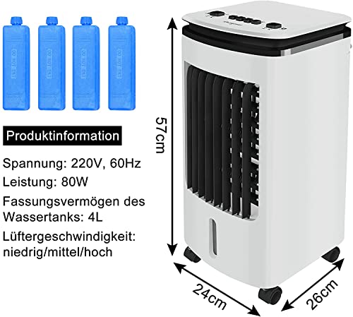 NAIZY Raffreddatore d'aria mobile da 80 W con telecomando senza tubo di scarico, 3 in 1 funzione 4L raffreddamento ad acqua d'aria 3 marce purificatore Portata d'aria di 270 m³/h, tipo A