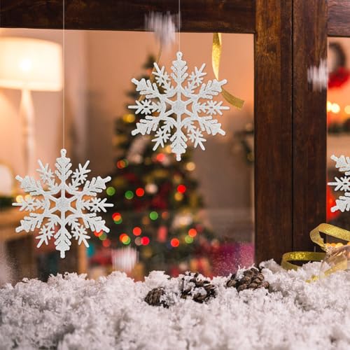 Naler 24PCS Bianco Glitter Shimmer Fiocco di Neve da Appendere Decorazioni per Albero di Natale Finestra Decorazione di Vacanza, Fai da Te, Matrimonio e Decorare
