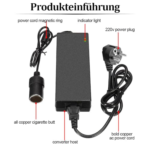 【Specifiche】Il convertitore trasformatore ha una custodia solida e un cavo di alimentazione robusto per durare a lungo. Tensione di ingresso: 100-240V, tensione di uscita: 12V 5A, potenza: 60W. Spina europea standard. Può facilmente fornire energia sufficiente per i dispositivi elettronici di bordo utilizzando la presa accendisigari da 12 V.