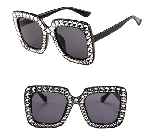 No Name Ltd Occhiali da sole neri oversize con strass scintillanti cornice quadrata, Nero lucido., XL