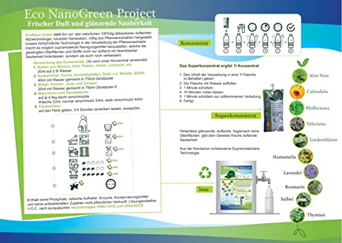 Lascia le superfici sgrassate e lucide, i tessuti puliti e morbidi, con un fresco e gradevole profumo. Come tutti i prodotti Eco Nano Green, il Multiuso è composto da ingredienti naturali, quali: aloe vera, calendula, menta piperita, valeriana, tiglio, amamelide, lavanda, rosmarino, salvia e timo.