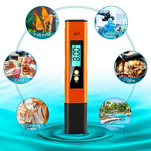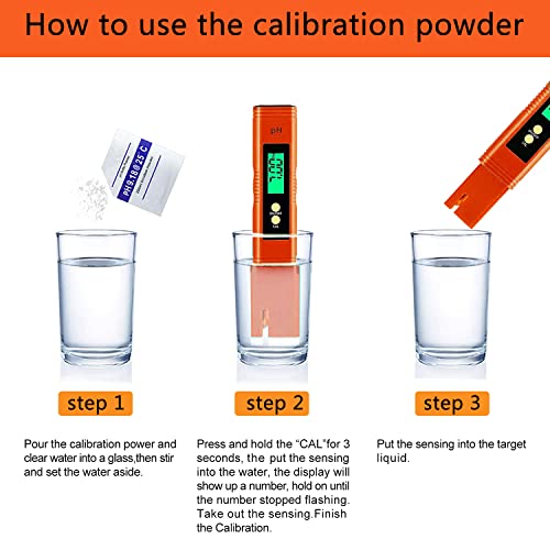 【Facile da Usare,Spegnimento Automatico】Seguire rigorosamente le istruzioni sul manuale,utilizzare polvere tampone ph standard per calibrare il phmetro acquario. Inserire il misuratore ph calibrato nella soluzione, attendere 5 secondi per controllare rapidamente e accuratamente la qualità dell'acqua.La funzione di spegnimento automatico può spegnere automaticamente il tester ph piscina durante il tempo di inattività,per garantire una maggiore durata della batteria.