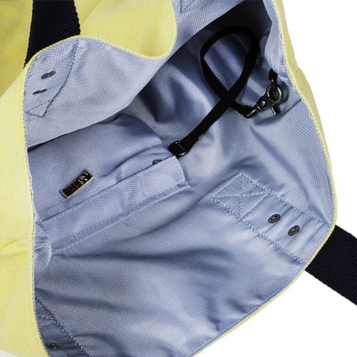 Due cinturini per un trasporto facile o sopra la spalla (45 cm di lunghezza) Puoi girare la borsa, hai una borsa gialla con stampa frontale blu / rossa Sul lato blu chiaro una tasca rimovibile con cerniera con bandierina cucita Rivetti con logo in rilievo sui cinturini