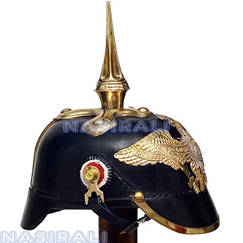 NASIR ALI - Elmo prussiano Pickelhaube, in pelle, con cinturino sottogola in ottone, Prima guerra mondiale