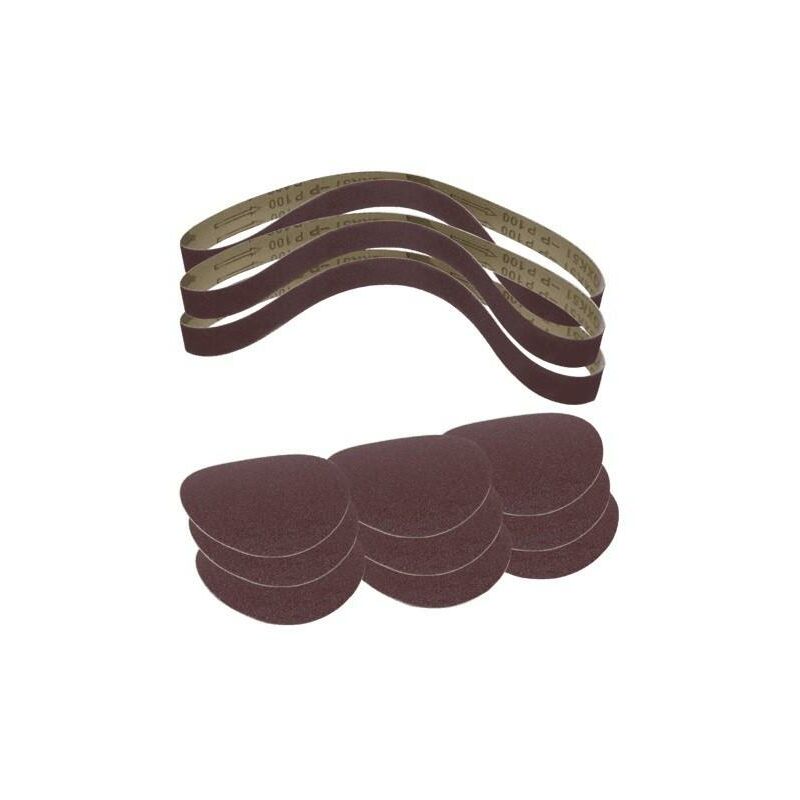 Kit 12 pezzi, composto da: 3 dischi abrasivi grana 80 3 dischi abrasivi grana 120 3 dischi abrasivi grana 180 1 nastro abrasivo grana 60 1 nastro abrasivo grana 100 1 nastro abrasivo grana 180