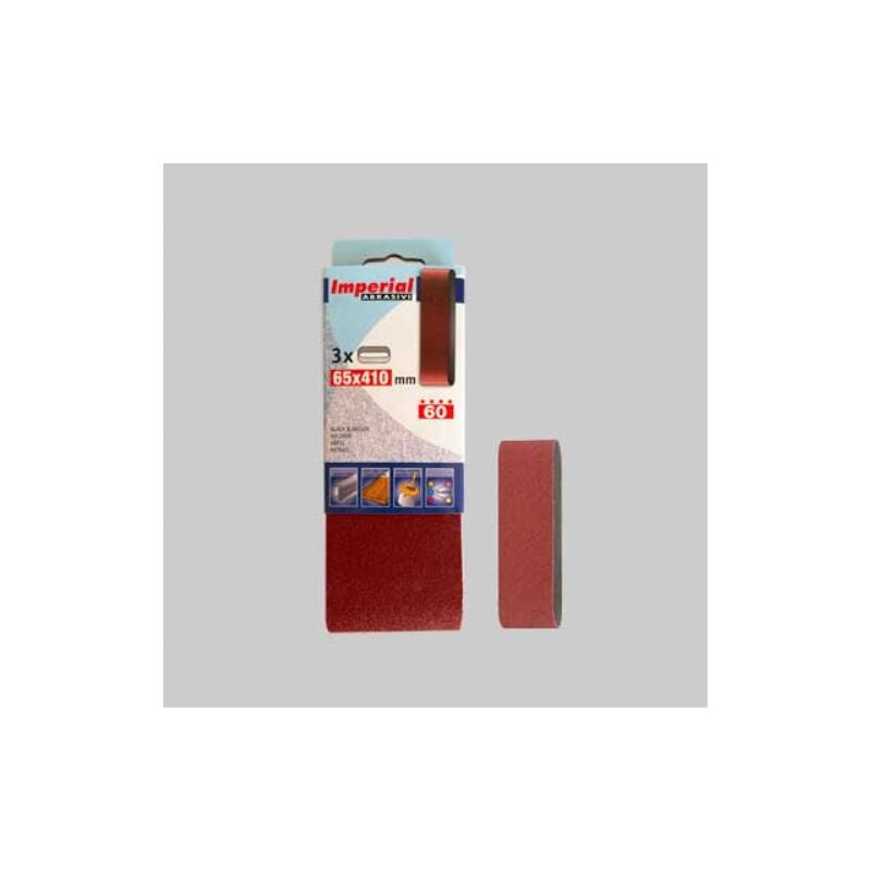 Dimensioni mm.65x410. Per levigatrici a nastro. Per sverniciare, pulire e levigare ferro, acciaio, legno e plastica, per rimuovere la ruggine e lavorare la carrozzeria. Nastro abrasivo 65x410 mm grana 120 - 3 pezzi IMPERIAL ABRASIVI Carta abrasiva