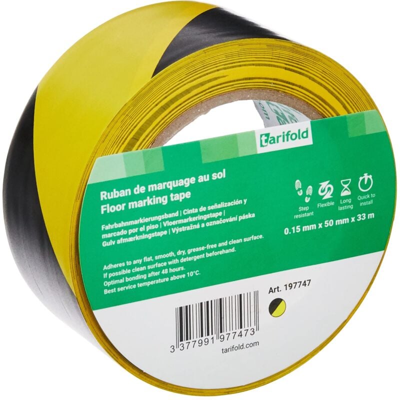 Descrizione Nastro segnaletico adesivo nero/giallo, in robusto vinile di spessore 150 micron, per aree interne pedonali o soggette a passaggio di veicoli standard, rotolo da 33 mt x 50 m. Adatto ad uso industriale o in aree pubbliche ad alta calpestabilità