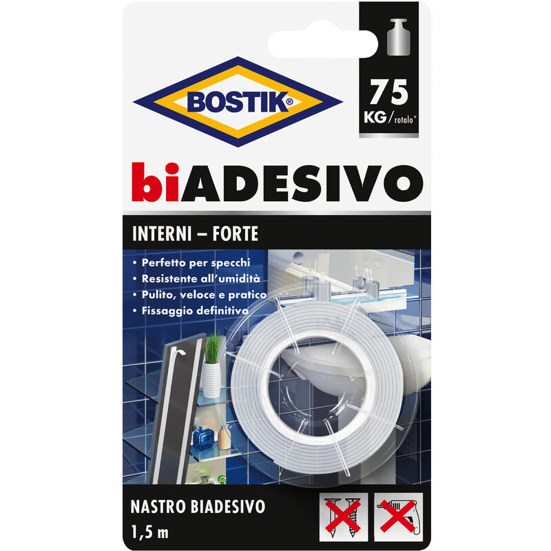 Nastro biadesivo extra forte per il montaggio e il fissaggio permanente di oggetti in ambienti interni. Lalternativa semplice a viti e chiodi. Offre una tenuta permanente e sicura su quasi tutte le superfici lisce, come ad esempio metallo, piastrelle, plastica, vetro e legno verniciato. Ideale per il fissaggio di specchi, portaoggetti, insegne, ganci, scaffali, canaline passacavi, oggetti e profili decorativi e molto altro. Massima capacità di carico dopo 60 minuti.Resistente allumidità. CAMPI DI APPLICAZIONE Per montare e fissare in modo semplice, rapido e pulito oggetti quali specchi, portasapone, ganci di sospensione, targhette identificative, portaoggetti in plastica e altro su superfici lisce e regolari, in ambienti interni. Perfetto per metallo, piastrelle, plastica, vetro, legno verniciato, ecc. Ideale per luso in bagno ed in cucina. Non indicato per applicazioni allesterno e su superfici irregolari. Proprietà: Nastro biadesivo in schiuma Extra forte Per superfici lisce Per