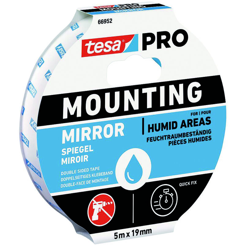 Tesa nastro biadesivo per specchi pro mounting mm. 19x5 mt. col. bianco Ideale per montaggi di specchi senza viti e attrezzi, facile da applicare, tenuta affidabile anche in ambienti umidi e bagnati. Si attacca a superfici lisce come le piastrelle e tiene in posizione oggetti piatti con spessore max mm. 4. Col. bianco. Articolo produttore: 66952-00004-01
